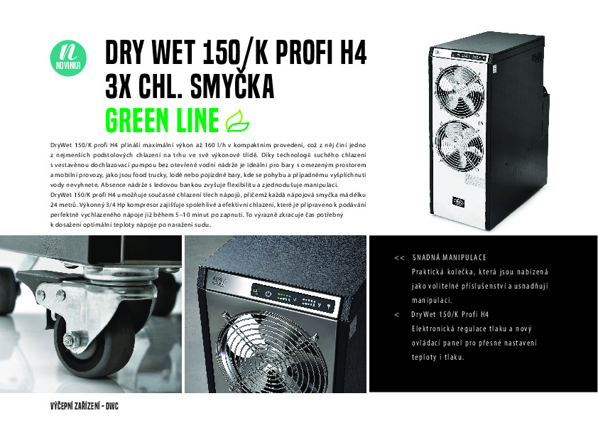 DryWet 150/K profi H4 umožňuje současné chlazení třech nápojů, přičemž každá nápojová smyčka má délku 24 metrů. Výkonný 3/4 Hp kompresor zajišťuje spolehlivé a efektivní chlazení, které je připraveno k podávání perfektně vychlazeného nápoje již během 5–10 minut po zapnutí. To výrazně zkracuje čas potřebný k dosažení optimální teploty nápoje po naražení sudu.