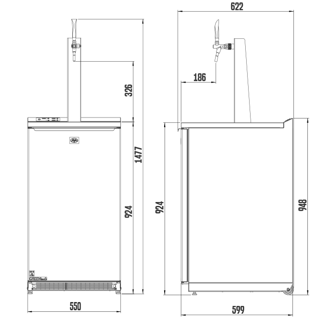 - FLEXIBILITA INSTALACE – Nasávání a výfuk vzduchu je umístěno v soklu, což umožňuje snadnou integraci zařízení do barového pultu bez nutnosti bočních větracích otvorů. Při použití jako samostatně stojící chladič umožňuje čistý design celoplošný polep nebo branding, případně doplnění podsvíceného reklamního panelu.