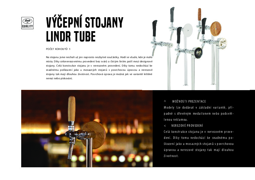 Minimalismus. Tak by se dal jedním slovem charakterizovat výčepní stojan LINDR TUBE. Skutečně jsme na něm nechali už jen naprosto nezbytné součástky. Hodí se tam, kde je opravdu málo místa, zároveň ale díky celonerezovnému provedení bez svárů a čistým liniím patří mezi designové stojany.