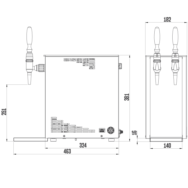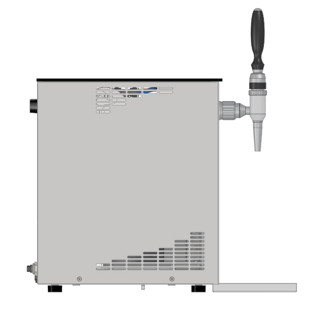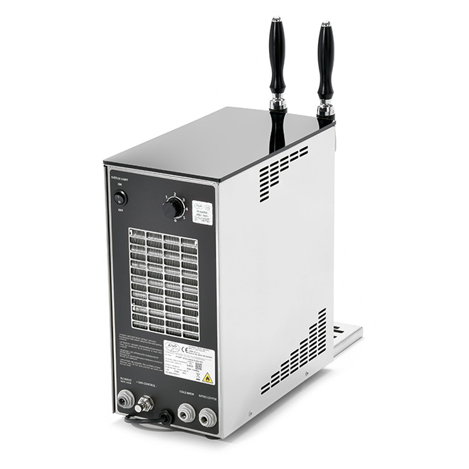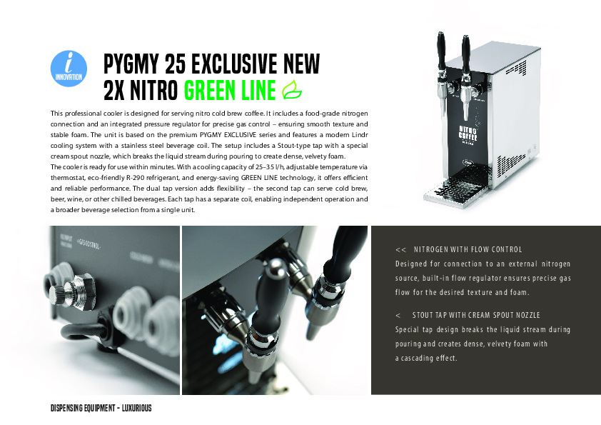 This professional cooler is designed for serving nitro cold brew coffee. It includes a food-grade nitrogen connection and an integrated pressure regulator for precise gas control – ensuring smooth texture and stable foam. The unit is based on the premium PYGMY EXCLUSIVE series and features a modern Lindr cooling system with a stainless steel beverage coil. The setup includes a Stout-type tap with a special cream spout nozzle, which breaks the liquid stream during pouring to create dense, velvety foam. The cooler is ready for use within minutes. With a cooling capacity of 25–35 l/h, adjustable temperature via thermostat, eco-friendly R-290 refrigerant, and energy-saving GREEN LINE technology, it offers efficient and reliable performance. Its compact size, stainless steel construction, and illuminated front panel with logo customization make it ideal for cafés, bars, catering, and mobile use.
