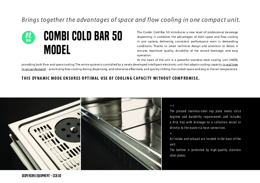 The CombiColdBar 50 introduces a new level of professional beverage dispensing. It combines the advantages of both space and flow cooling in one system, delivering consistent performance even in demanding conditions. Thanks to smart technical design and attention to detail, it ensures maximum quality, durability of the served beverage, and easy operation.