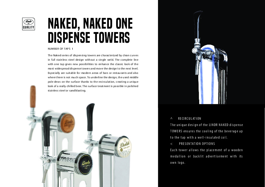 - RECIRCULATION - The unique design of the LINDR NAKED dispense TOWERS ensures the cooling of the beverage up to the tap with a well-insulated coil. "