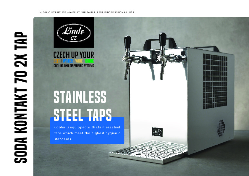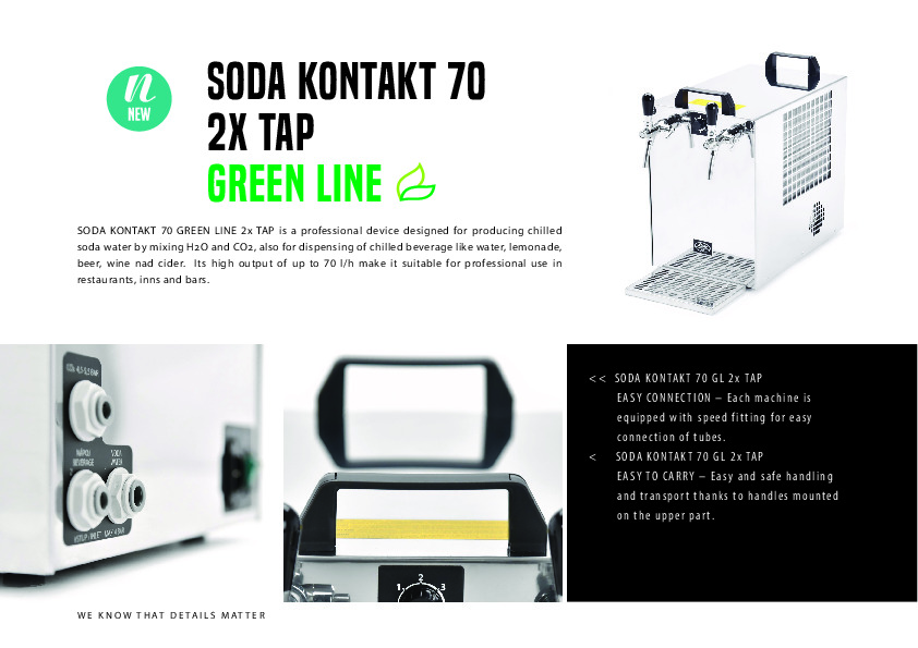 SODA KONTAKT 70 GREEN LINE 2x taps is a professional device designed for producing chilled soda water by mixing H2O and CO2, also for producing chilled beverage like water, lemonade, beer, wine nad cider. Its high output of 70 l/h makes it suitable for professional use in restaurants, inns and bars.