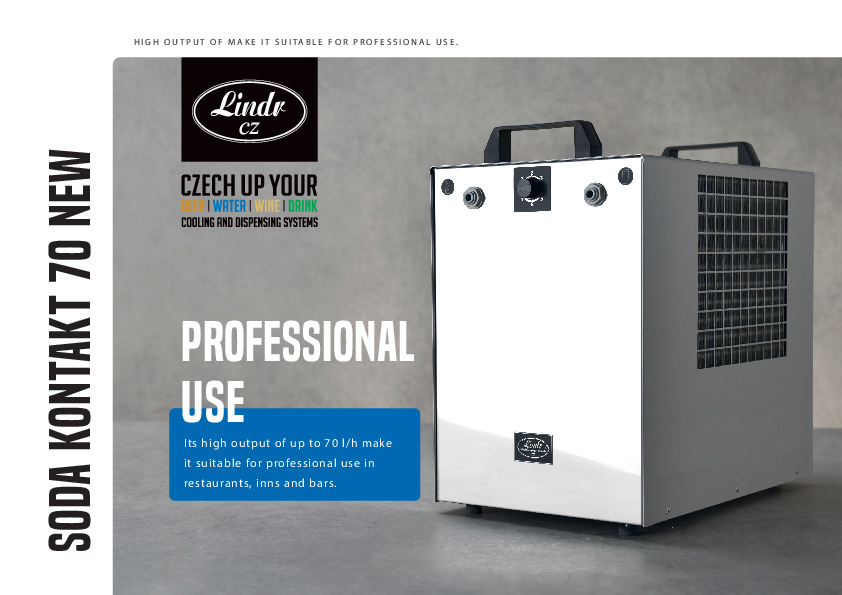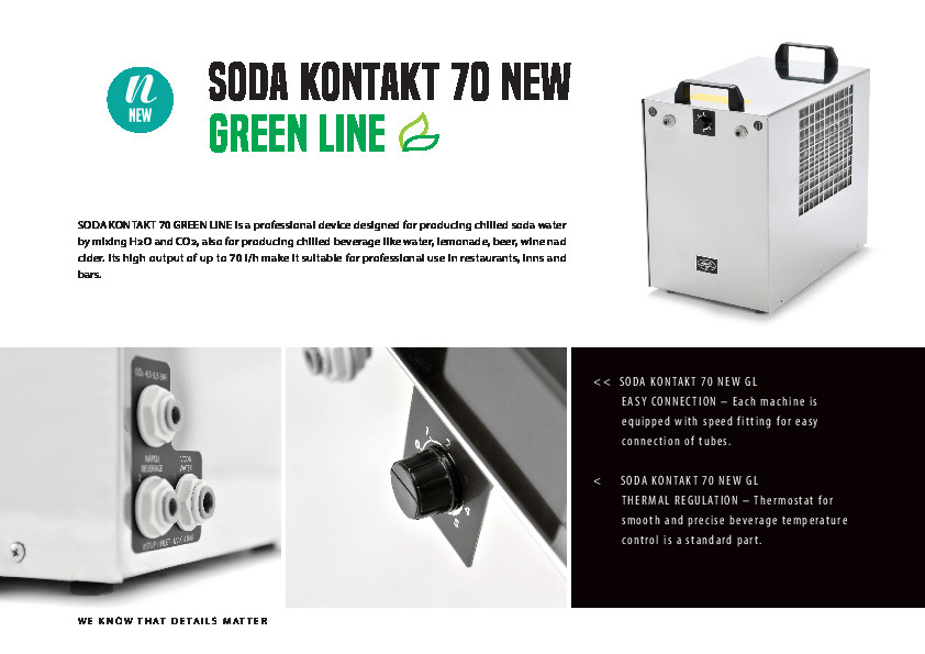 SODA KONTAKT 70 GREEN LINE is a professional device designed for producing chilled soda water by mixing H2O and CO2, also for producing chilled beverage like water, lemonade, beer, wine nad cider. Its high output of up to 70 l/h make it suitable for professional use in restaurants, inns and bars.