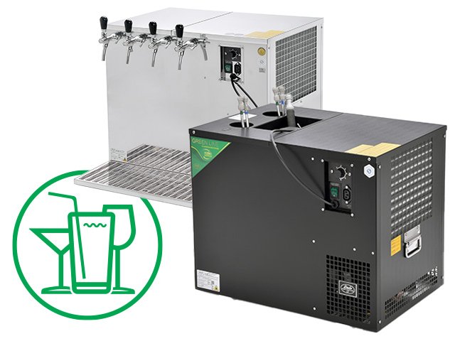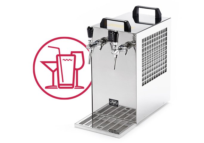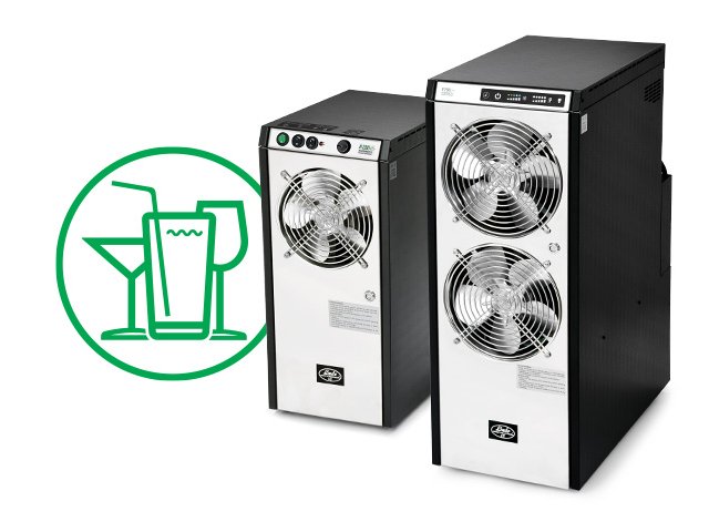 Professional under-counter beer coolers use a water exchanger for cooling, from which the evaporator forms an ice bank. It is used in combination with a dispense tower and has a vertical orientation. It can be used in pubs, bars and restaurants.